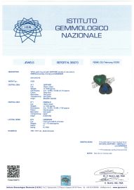 in oro bianco 18kt, impreziosito da uno smeraldo colombiano taglio cuore di ct 4.50 circa e uno zaffiro taglio cuore di ct 5 circa, affiancati da diamanti taglio princess per ct 1.10 circa, punzone 750 e del fabbricante, firmato Giulio Veronesi, mis. 14/54, gr. 8. Corredato di certificato IGN del 3/02/2026 attestante le caratteristiche delle pietre.
