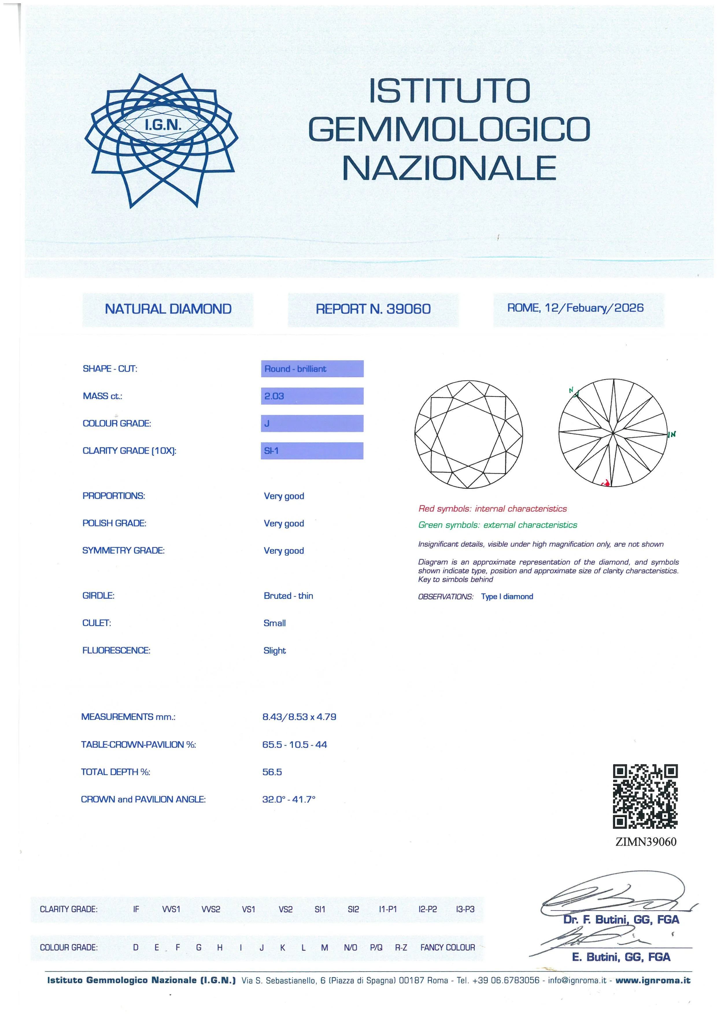 in oro giallo 18kt, diamante taglio brillante (smontato) di 2.03, colore J, purezza Si1, gambo a spirale, mis. 15/55, gr. 7. Corredato di certificato IGN del 12/02/2026 attestante le caratteristiche della pietra.