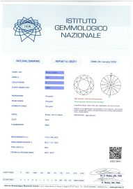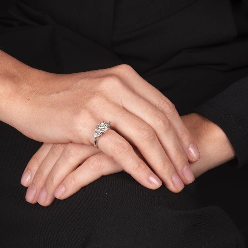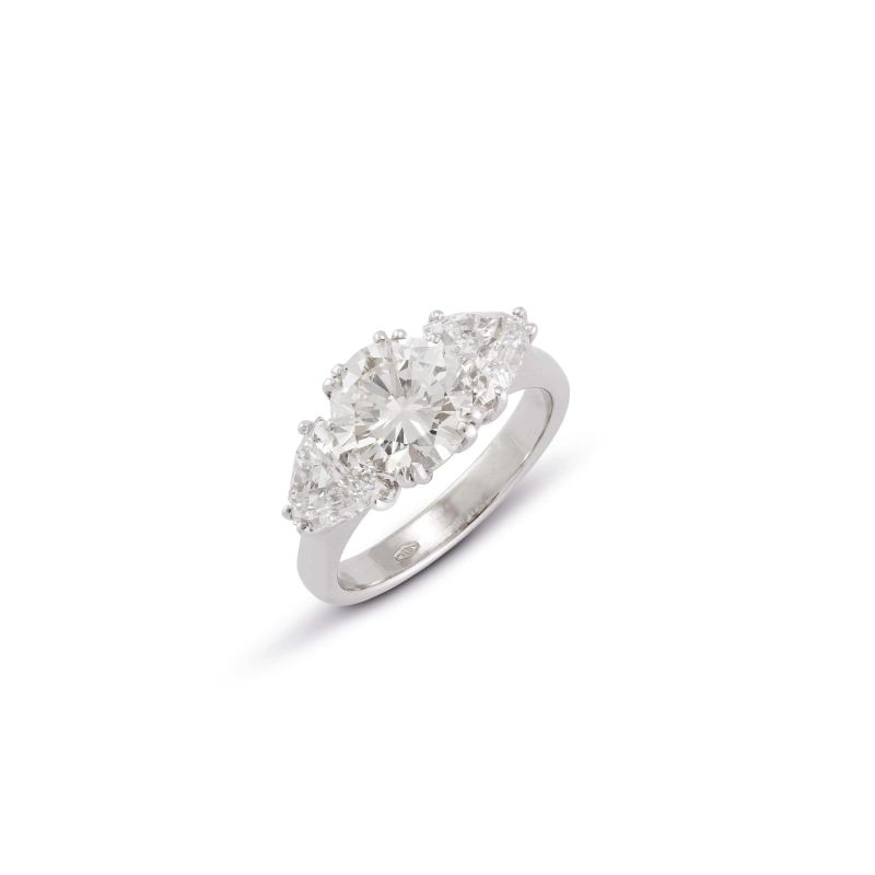 in oro bianco 18kt, impreziosito al centro da un diamante taglio brillante di ct 1.67, colore K, purezza Vvs2, affiancato da diamanti taglio trilliant per ct 1.20 circa, punzone 750, mis. 10/50, gr. 5. Corredato di certificato IGN del 29/01/2026 attestante le caratteristiche della pietra.