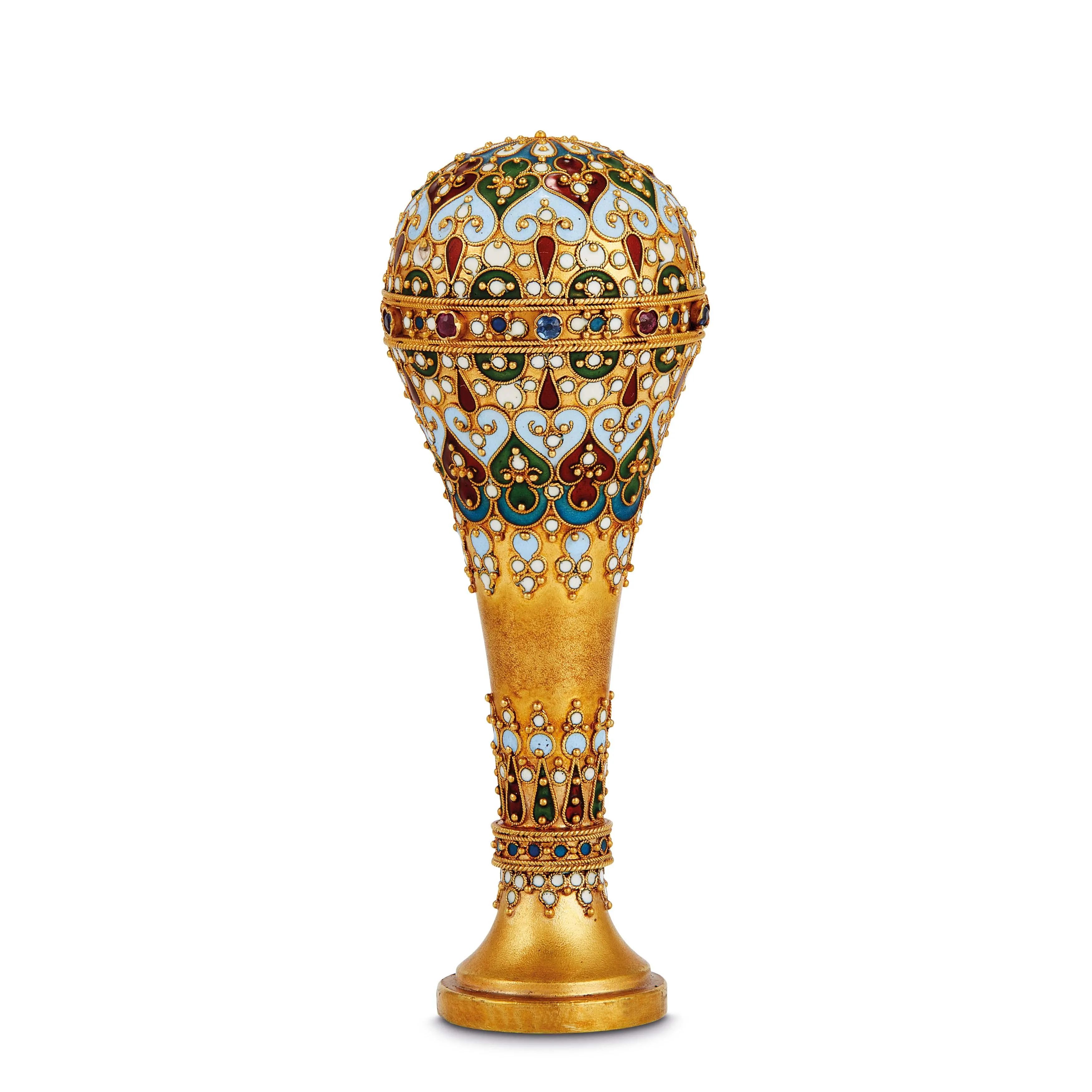 in oro 18kt, decorato con smalti policromi e impreziosito da piccoli rubini e zaffiri, dim. cm 6x2.5, gr. 18