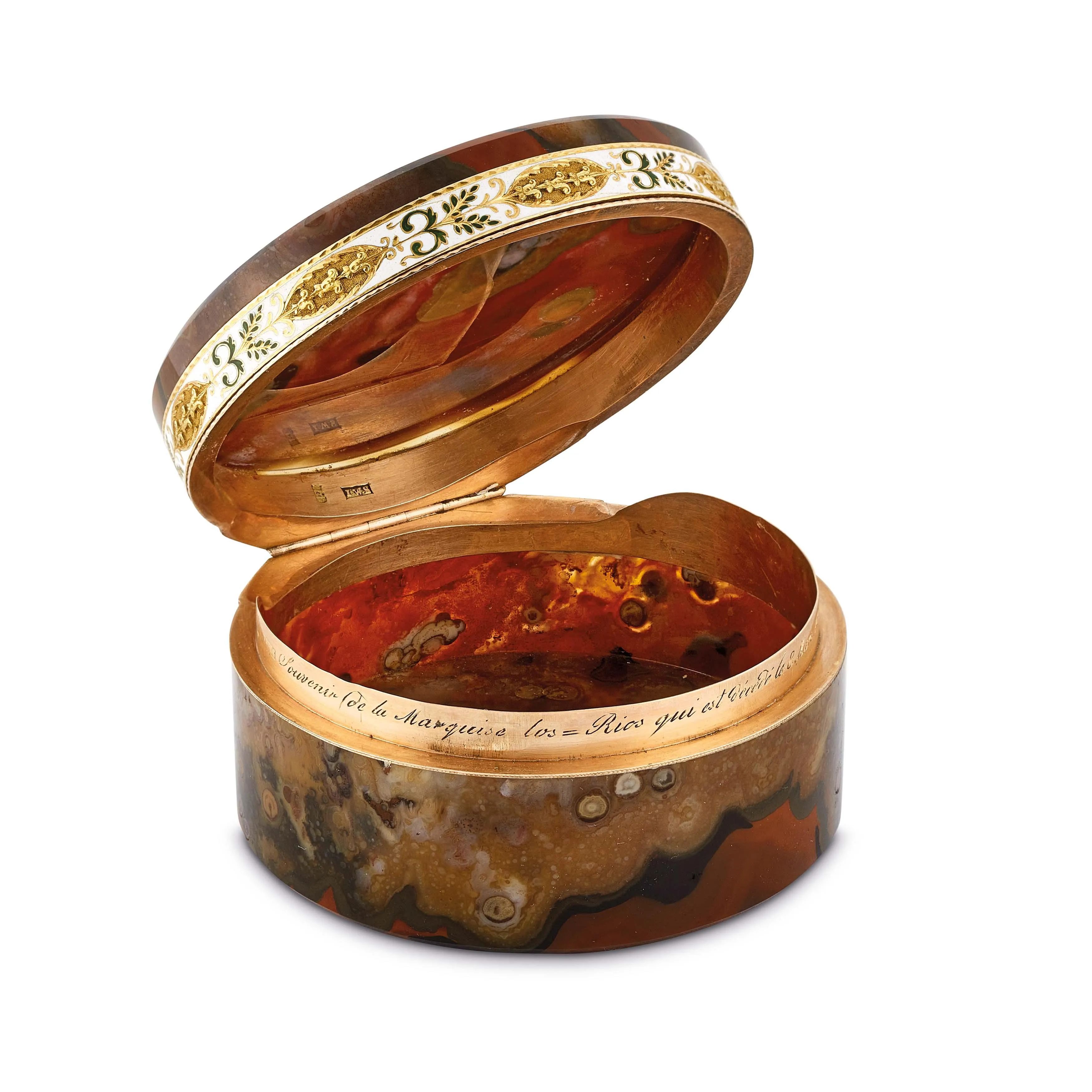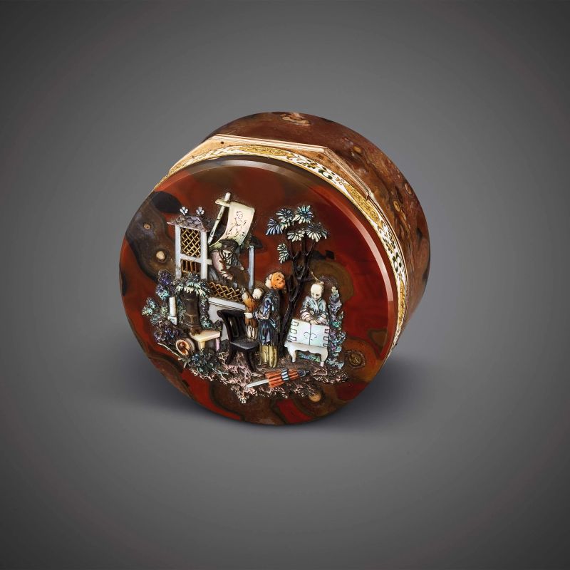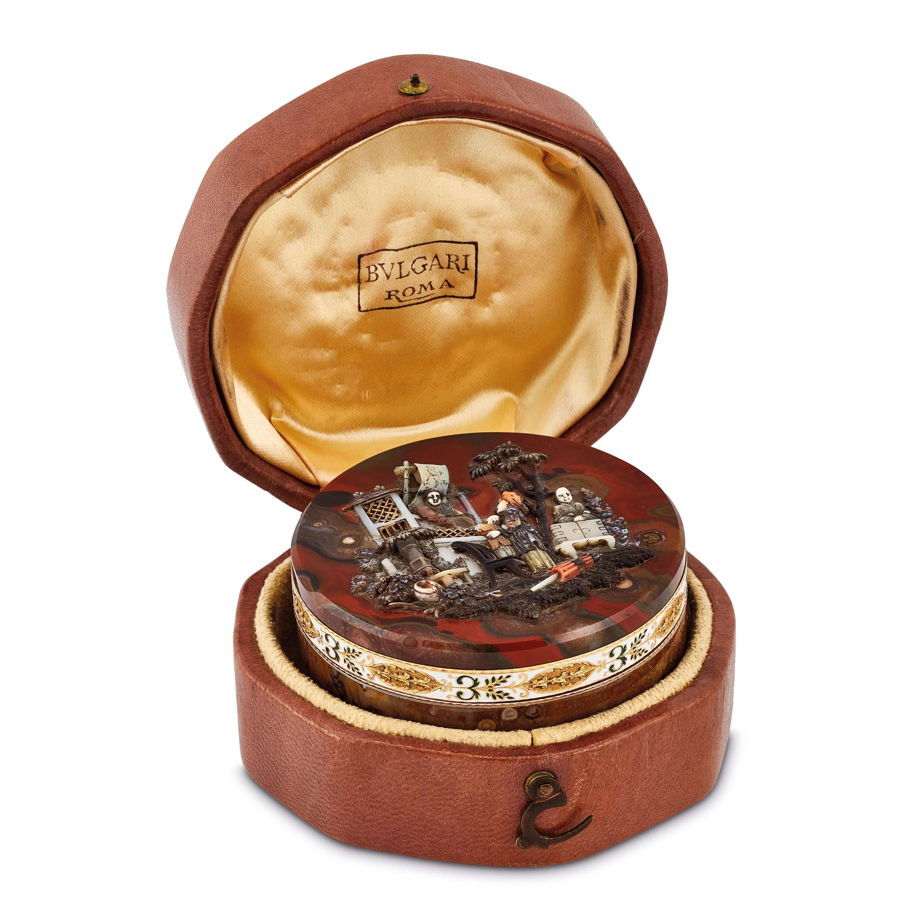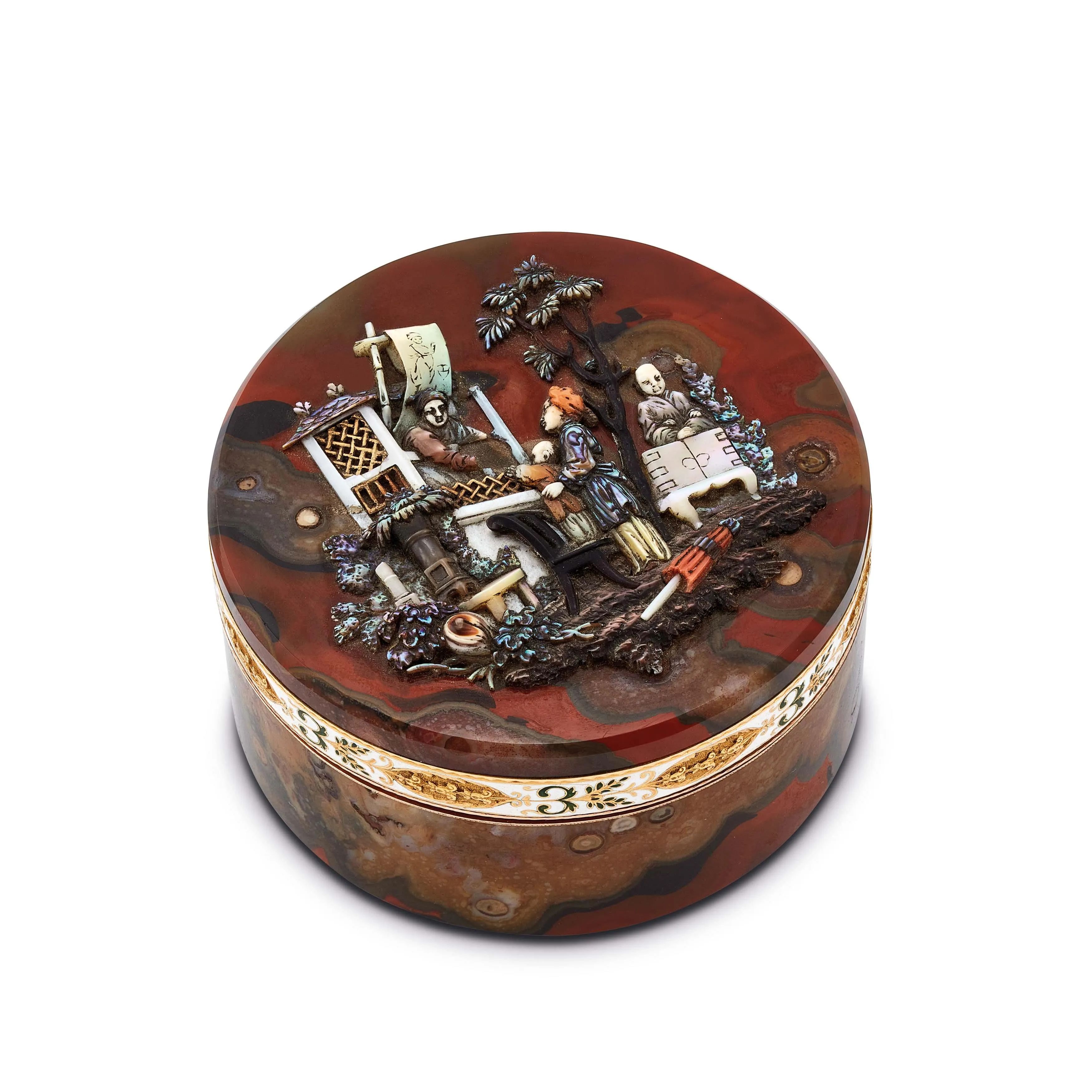 in oro rosa e giallo 14kt, con intagli in madreperla multicolore, raffiguranti scene di vita decorata da motivi floreali e fogliacei incisi e smaltati, punzone francese, diam. cm 6.5, gr. 138.
