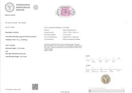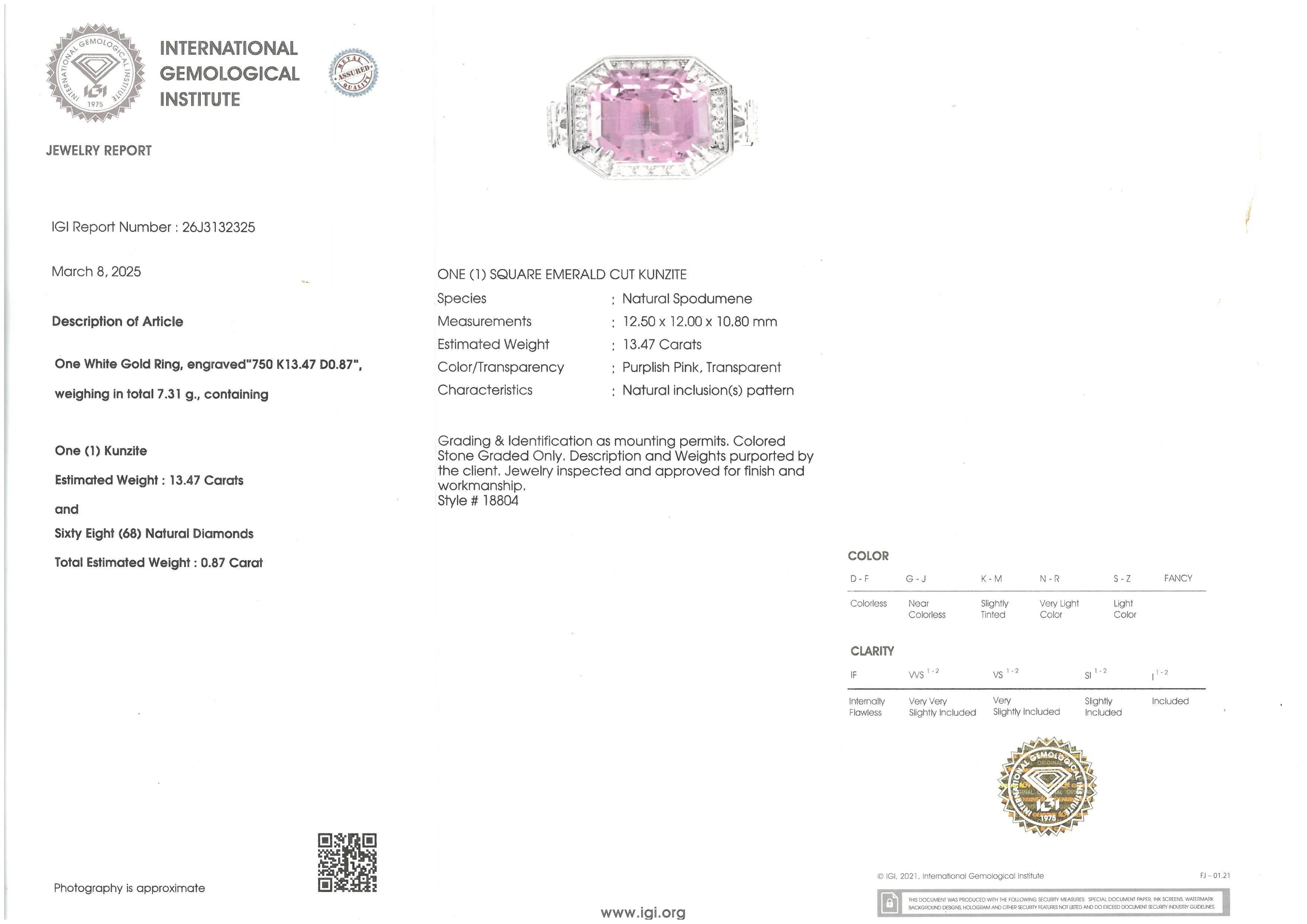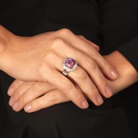 in oro bianco 18kt, impreziosito al centro da una kunzite di ct 13.47, rettangolare taglio ottagonale, contornata da diamanti taglio brillante per ct 3 circa e smalto, punzone 750 e del fabbricante, mis. 12/52, gr. 7. Corredato di certificato IGI dell'8/03/2025 attestante le caratteristiche della pietra.