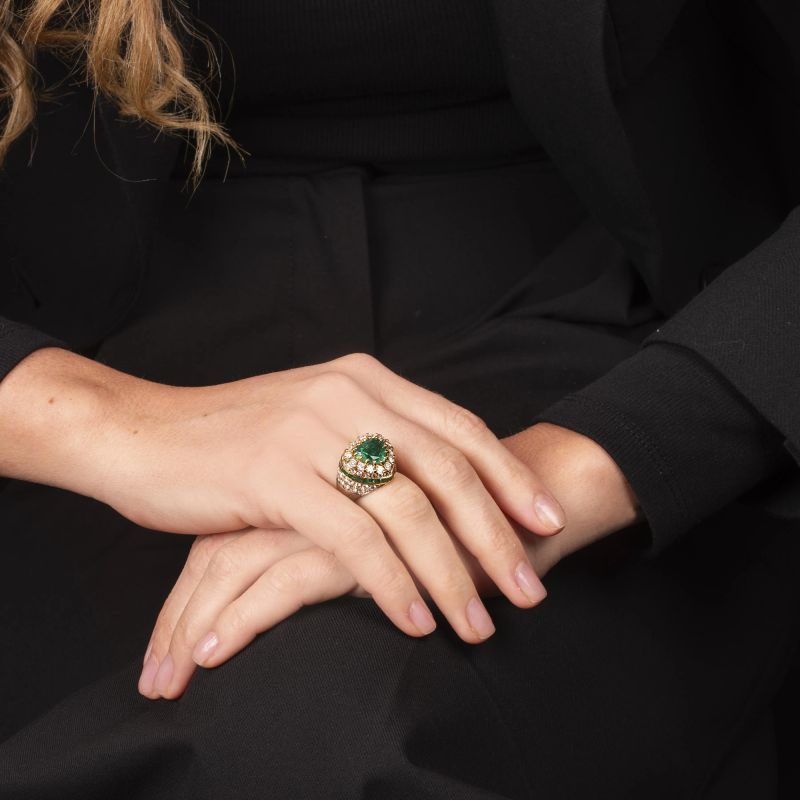 in oro giallo 18kt, impreziosito al centro da uno smeraldo colombiano taglio cuore di ct 3.30 circa, smeraldi taglio carrè di ct 0.70 circa, diamanti taglio brillante di ct 3 circa, punzone 750 e del fabbricante, firmato Moroni, mis. 12/52, gr. 14. Corredato di certificato IGN del 28/10/2025 attestante le caratteristiche della pietra.