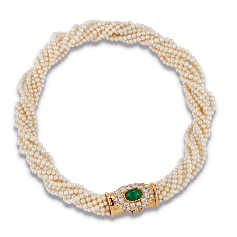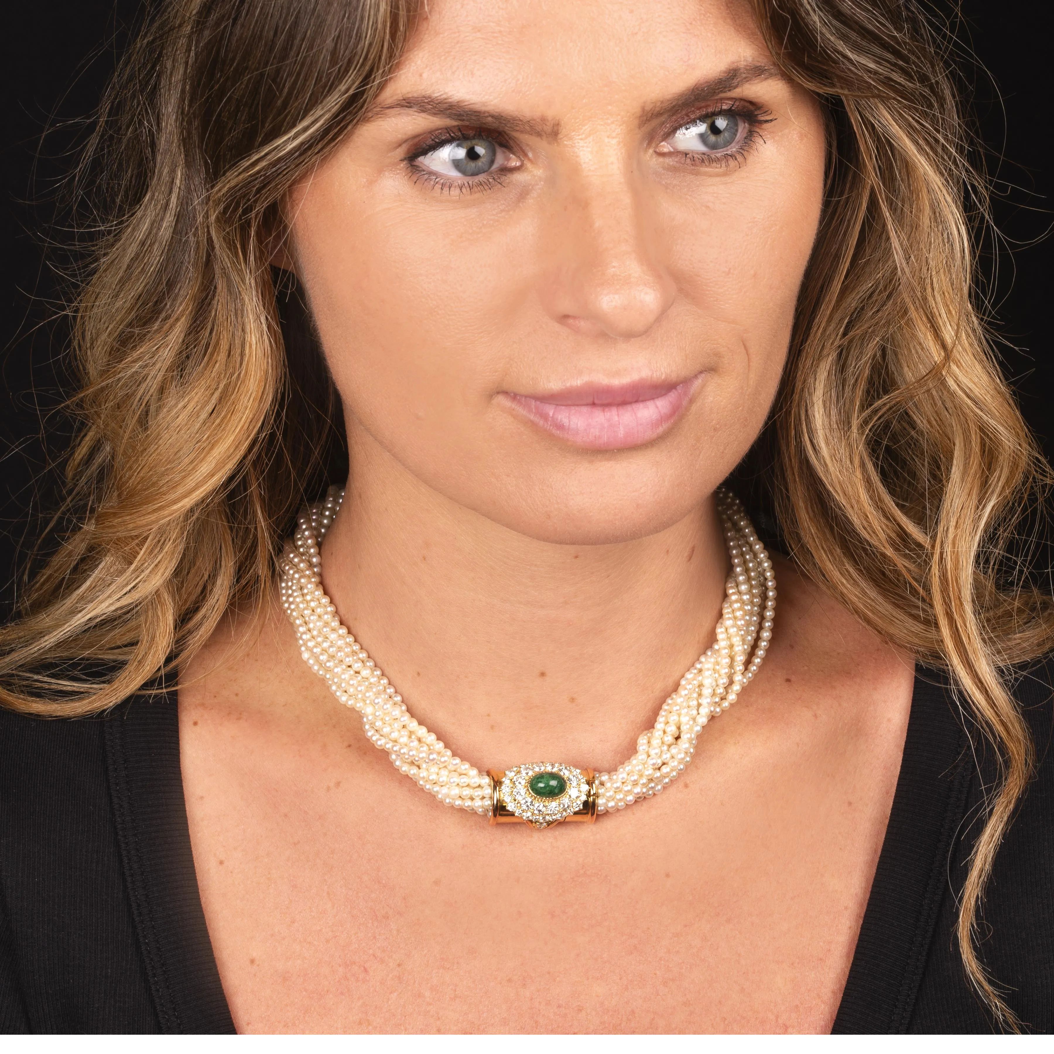 composta da 10 fili di perle di mm 3 circa, fermatura in oro giallo e rosa 18kt impreziosita da diamanti taglio brillante per ct 4.30 circa e uno smeraldo cabochon di ct 2.40 circa, chiusura a cassetta, punzone 750, lungh. cm circa, gr. 84