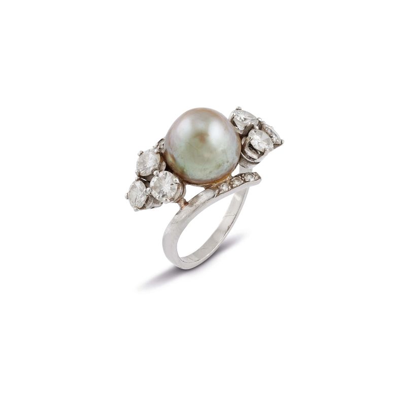 NATURAL PEARL AND DIAMOND RING IN 18KT WHITE GOLD