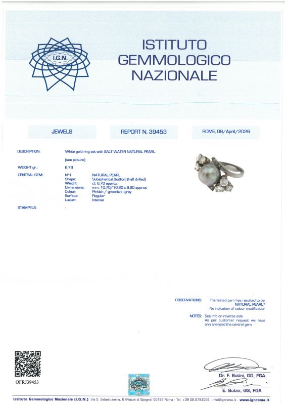 in oro bianco 18kt, impreziosito al centro da una perla di mm 10 circa, affiancata da diamanti taglio brillante per ct 1.50 circa, mis. 15/55, gr. 6. Corredato di certificato IGN del 09/04/2026 attestante le caratteristiche della perla.