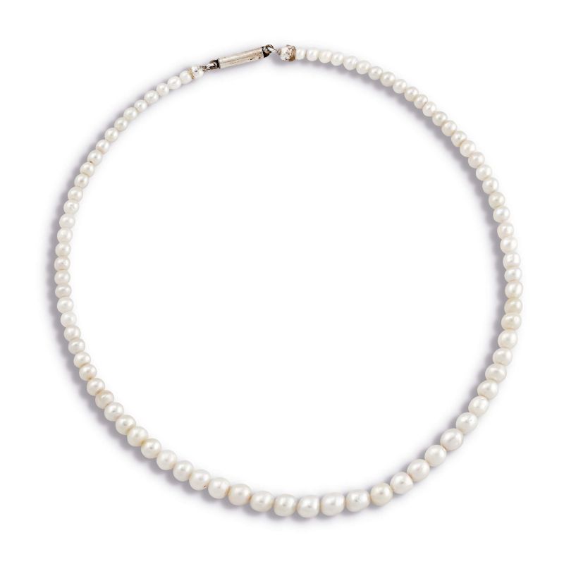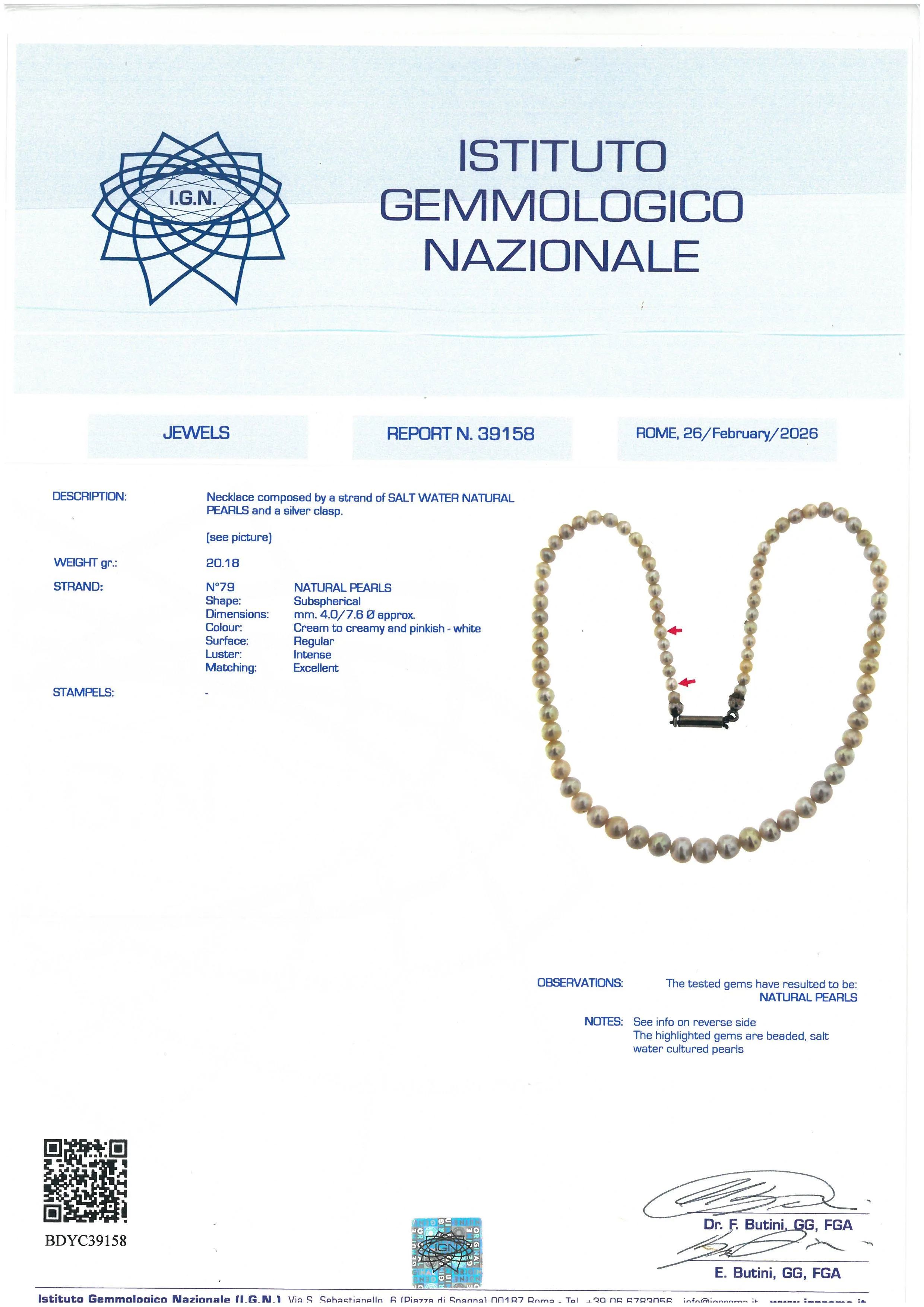 composta da un filo di perle naturali digradanti di mm 7-4 circa, fermatura in oro 9kt giallo e bianco, lungh. cm 46.5, gr. 20. Corredata di certificato IGN del 26/02/2026 attestante le caratteristiche.