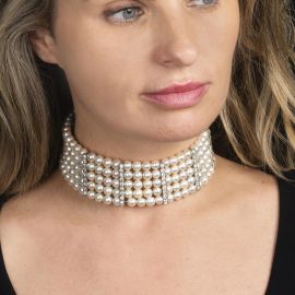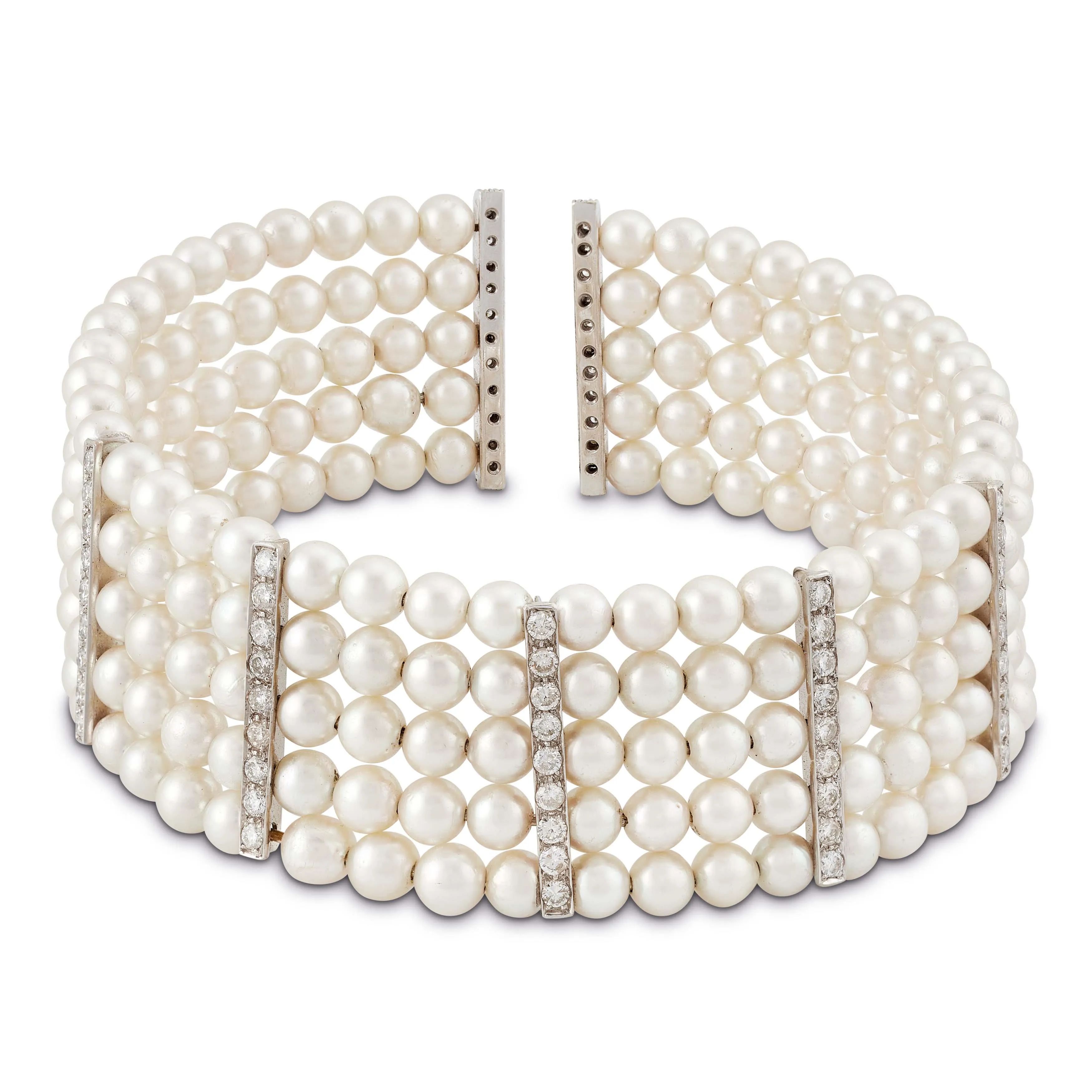 composto da cinque fili di perle (difetti) di mm 7 circa, distanziali in oro bianco 18kt impreziositi da diamanti taglio brillante (difetti), per ct 5.80 circa, aperto sul retro, diam. cm 10, gr. 188