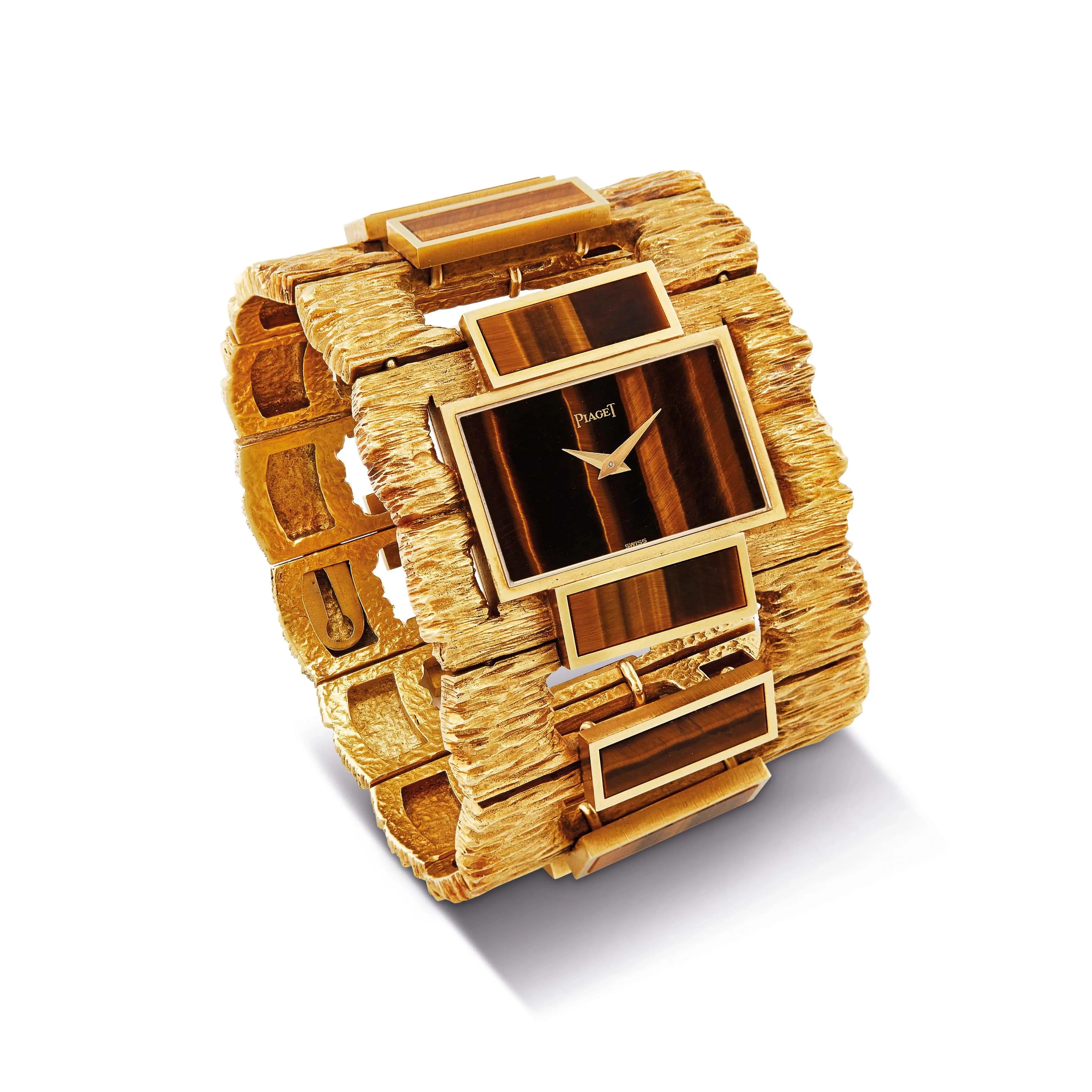 cassa di forma in oro giallo 18kt, fondello serrato con viti, quadrante occhio di tigre, grafica oro, movimento a carica manuale, vetro minerale, bracciale in oro giallo 18kt, con motivo a corteccia, distanziali con occhio di tigre, chiusura a cassetta, firmato Piaget, punzone 750, diam. cm 5, gr. 167