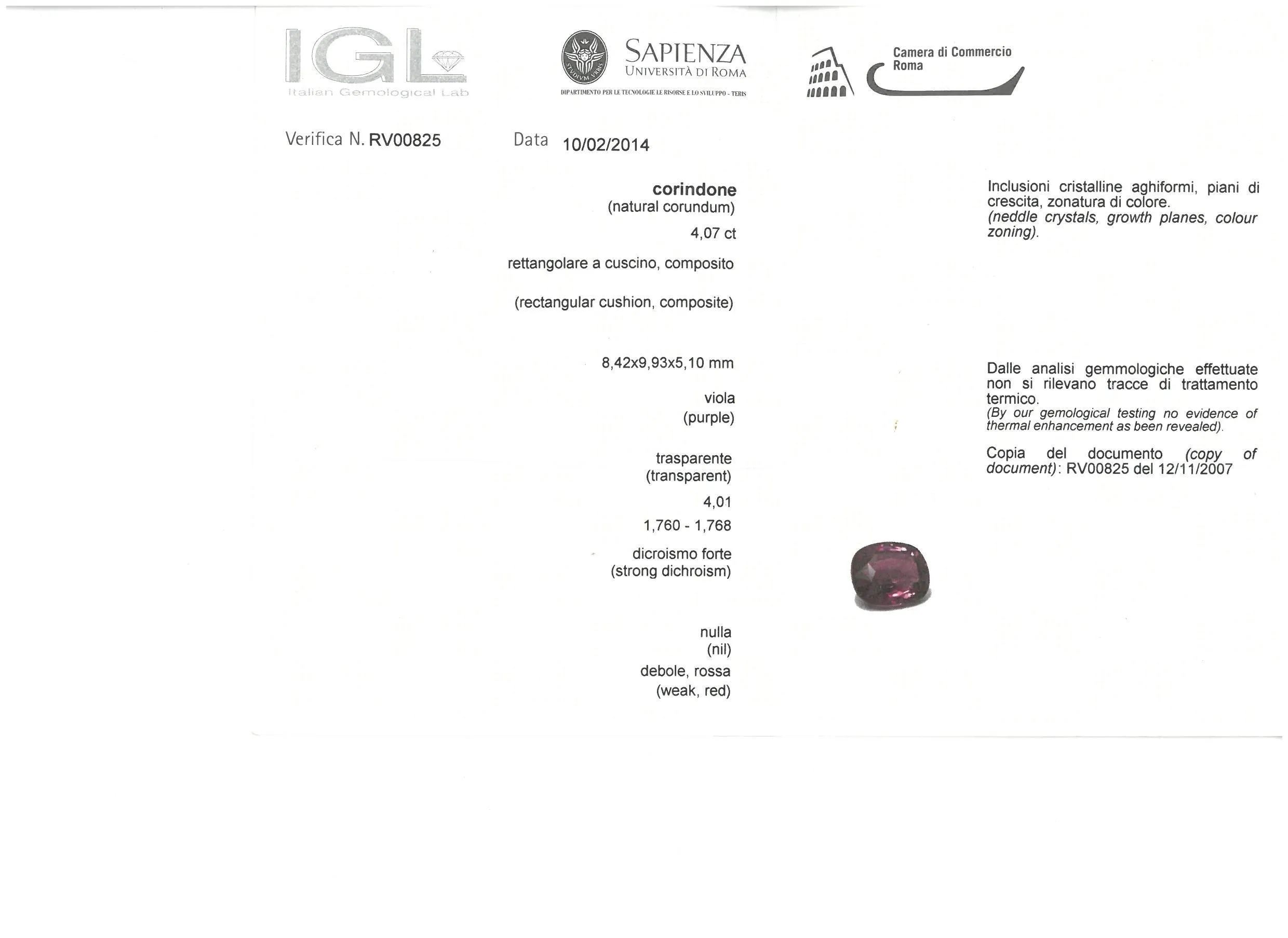 in oro bianco 18kt, impreziosito da uno zaffiro taglio rettangolare a cuscino di ct 4.07 (peso inciso), affiancato da diamanti taglio triangolare per ct 0.70 circa, e diamanti taglio brillante per ct 1 circa, punzone 750, mis. 12/52, gr. 3. Corredato di certificato IGL del 10/02/2014 attestante le caratteristiche della pietra.