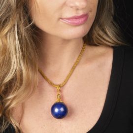 composta da una collana a cordone in oro giallo 18kt, chiusura a cassetta, lungh. cm 38, gr. 24, dal quale pende una grande sfera in lapislazzuli, dim. cm 3x3, gr. 46