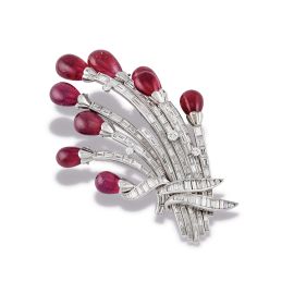 in oro bianco 18kt, impreziosita da file di diamanti taglio baguette per ct 6 circa, diamanti taglio brillante e huit huit per ct 0.50 circa e rubelliti taglio a goccia cabochon, dim. cm 8x5.2, gr. 51