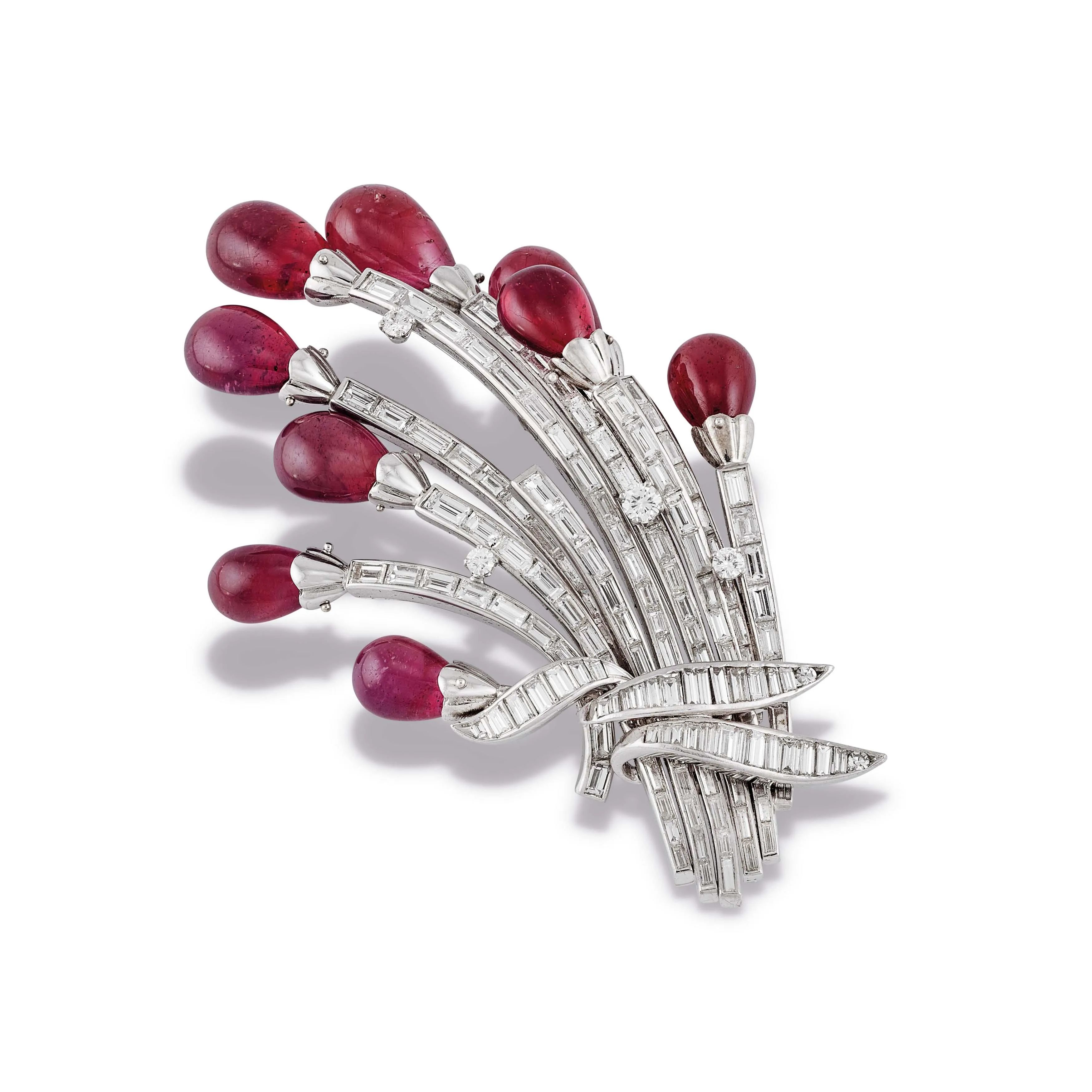 RUBELLITE AND DIAMOND BROOCH IN 18KT WHITE GOLD