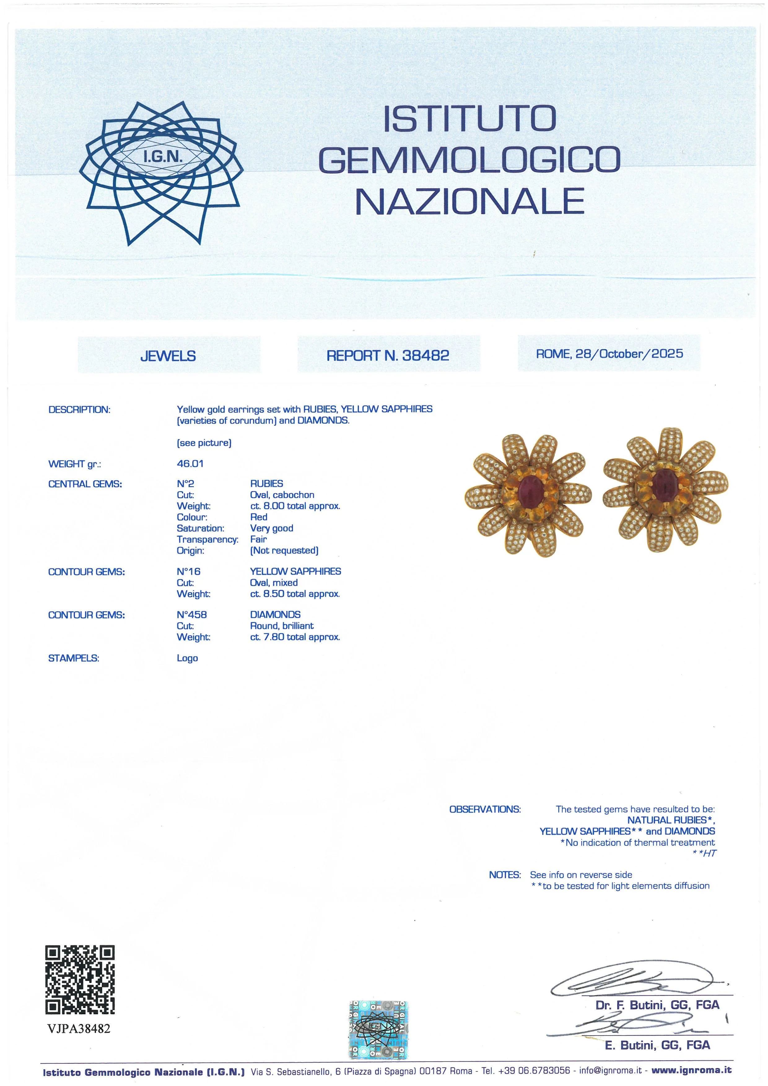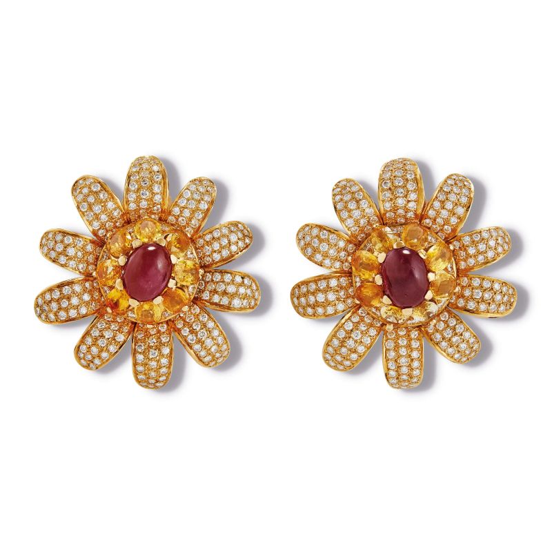 RUBY YELLOW SAPPHIRES AND DIAMOND FLORAL EARRINGS IN 18KT TWO TONE GOLD