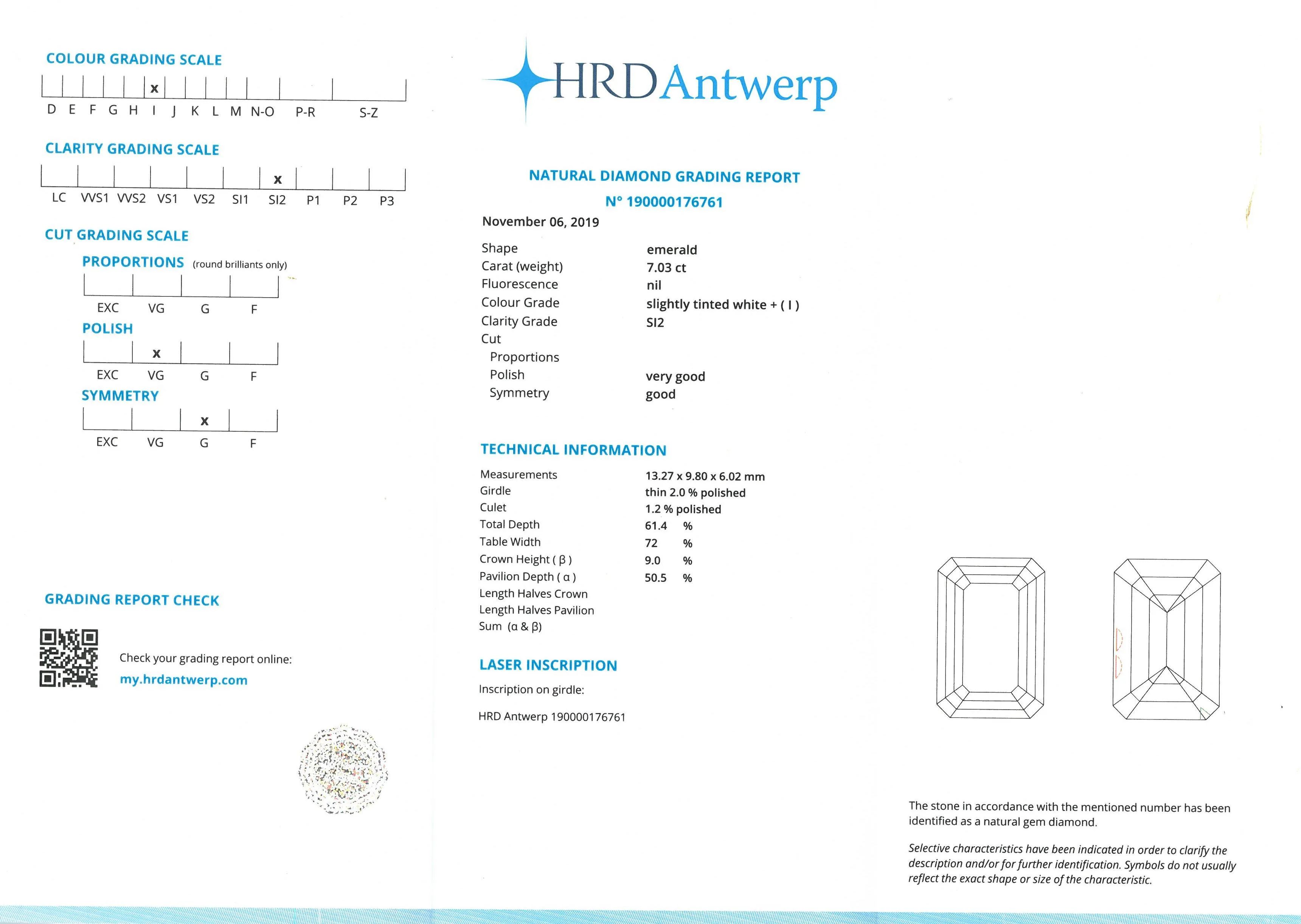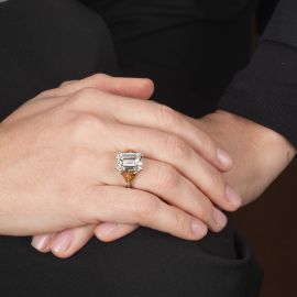 in platino, impreziosito al centro da un diamante taglio smeraldo (smontato) di ct 7.03, colore I, purezza Si2, affiancato da diamanti triangolari (trattati) di ct 2 circa, punzone del platino, mis. 10/50, gr. 5. Corredato di certificato HRD Antwerp del 06/11/2019 attestante le caratteristiche della pietra.