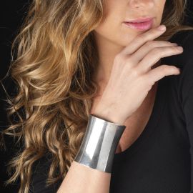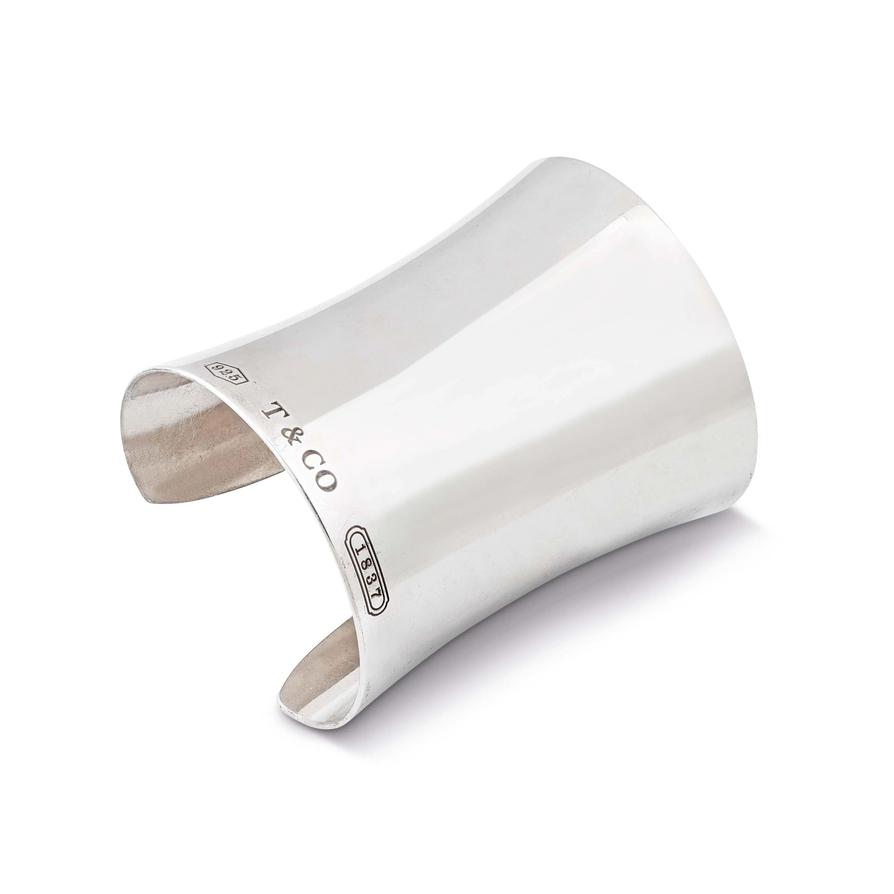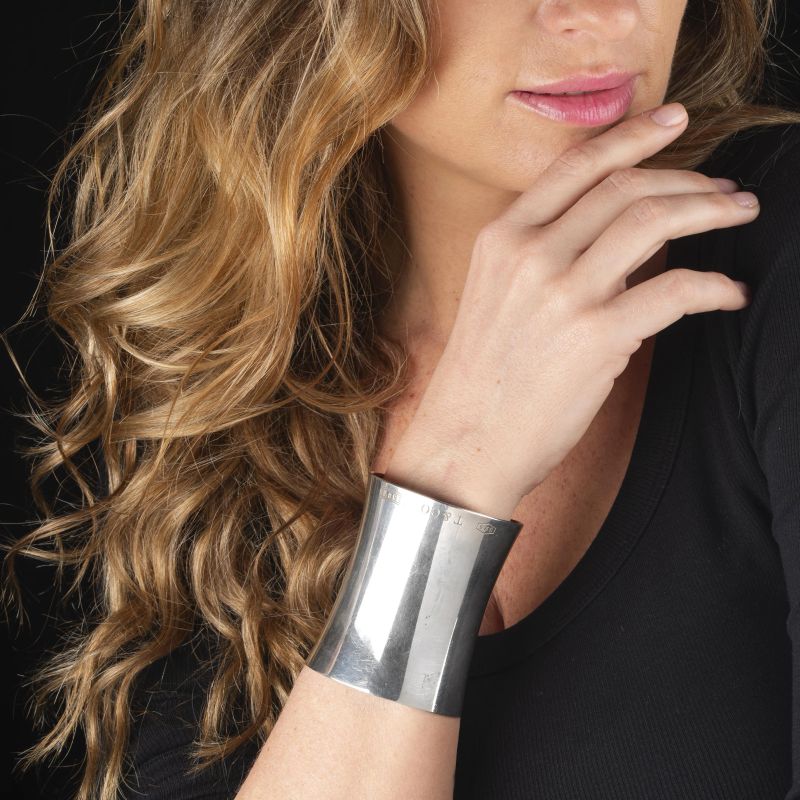 in argento, con polsino aperto, punzone 925, firmato Tiffany & Co, dim. cm 6x7.5, diam. cm 5, gr. 91. Corredato di scatola e busta.