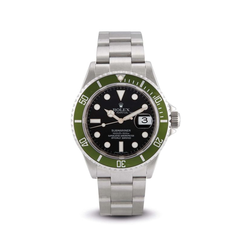 cassa in acciaio, fondello serrato a vite, corona marcata, ghiera girevole con inserto verde "Kermit", quadrante nero, grafica bianca, indici bicchierini al superluminova, datario a ore tre con lente cyclope, movimento a carica automatica, bracciale oyster in acciaio a maglie piene ref. 93250, cod. produzione PJ3, lungh. interna cm 20, chiusura a scatoletta in acciaio marcata Rolex, vetro minerale. Diam. mm 40. Corredato di garanzia di revisione Rolex.