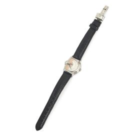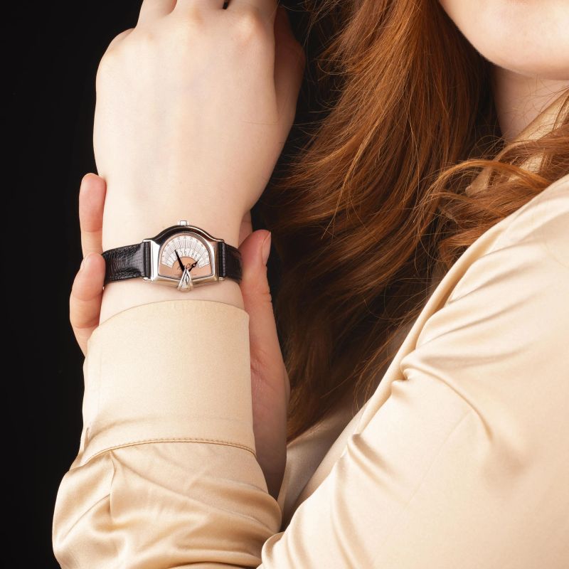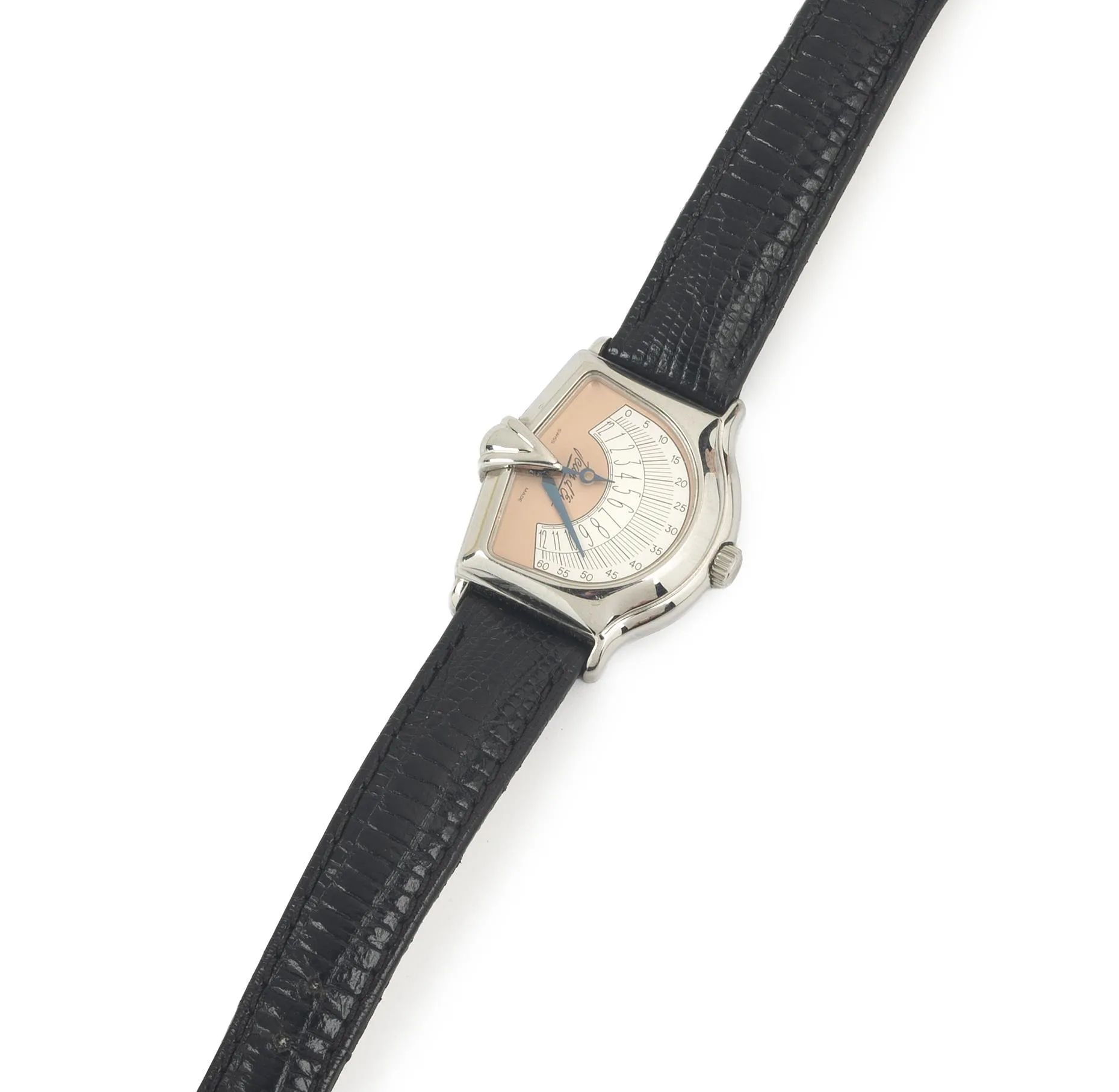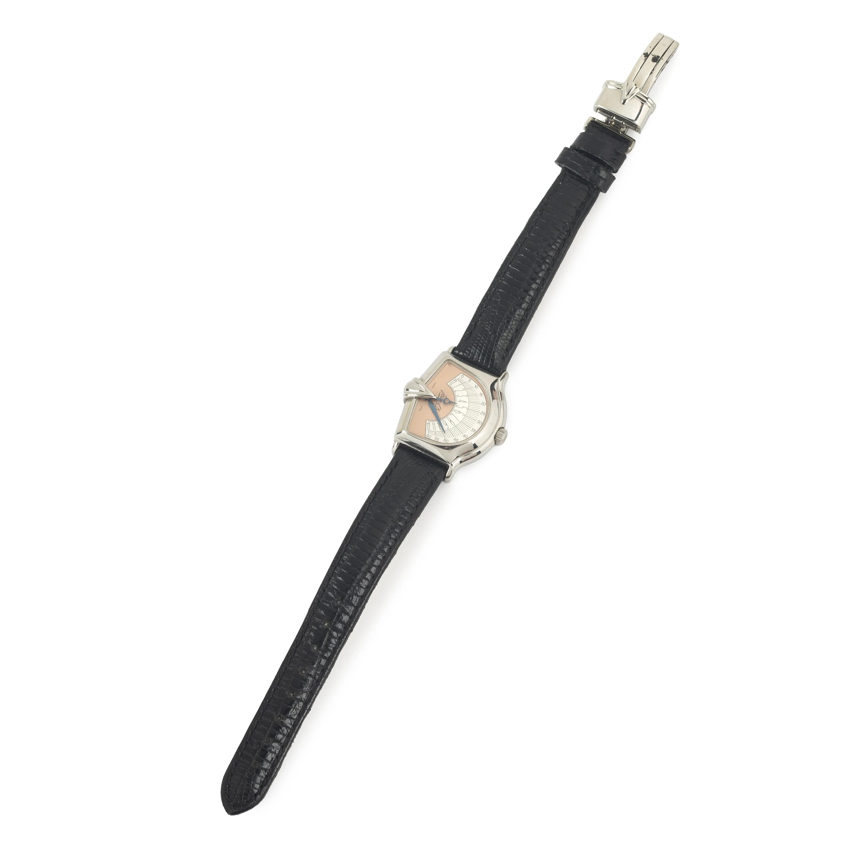 cassa di forma a ventaglio, fondello serrato con viti, lunetta sagomata, quadrante salmone/argentè, grafica nera, numeri arabi, movimento al quarzo, cinturino in pelle nera con fibbia deployant in acciaio originali, vetro minerale. Dim. mm 28x34