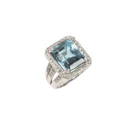 in oro bianco 18kt, impreziosito al centro da un'acquamarina taglio rettangolare per ct 10 circa e diamanti taglio brillante per ct 0.40 circa, punzone 750, mis. 15/55, gr. 18