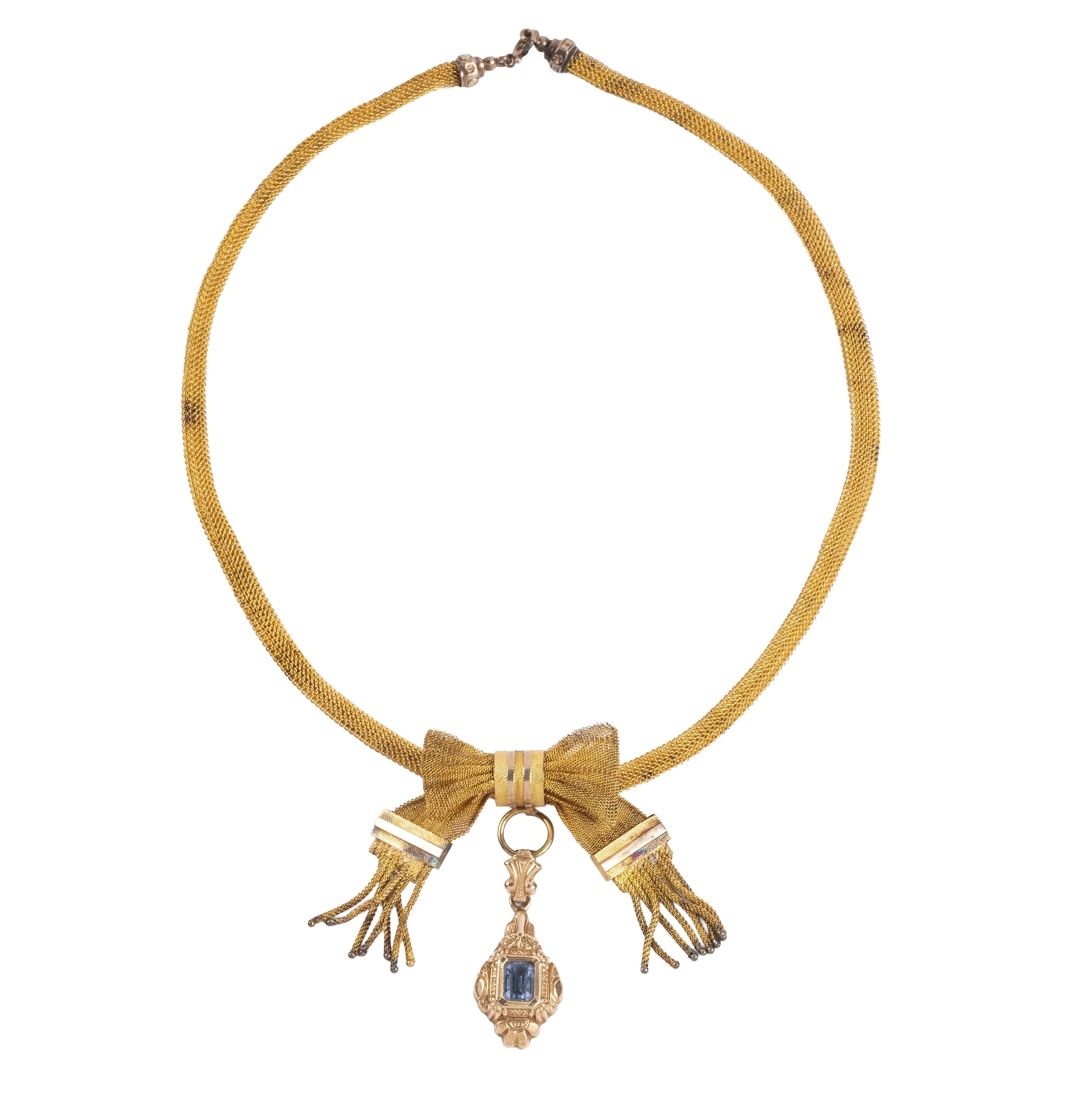 in oro giallo 12kt, con fiocco dal quale pende una pietra sintetica taglio rettangolare, chiusura a moschettone con elementi floreali incisi, punzone 500 e del fabbricante, lungh. cm 40 circa, gr. 29