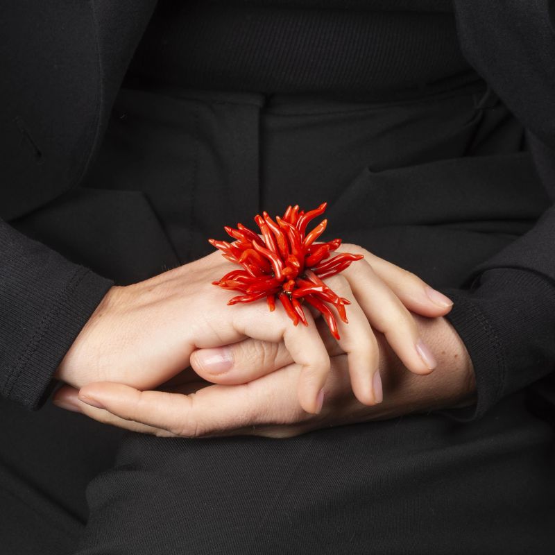 ANELLO A SIGILLO CON CORNETTI IN CORALLO