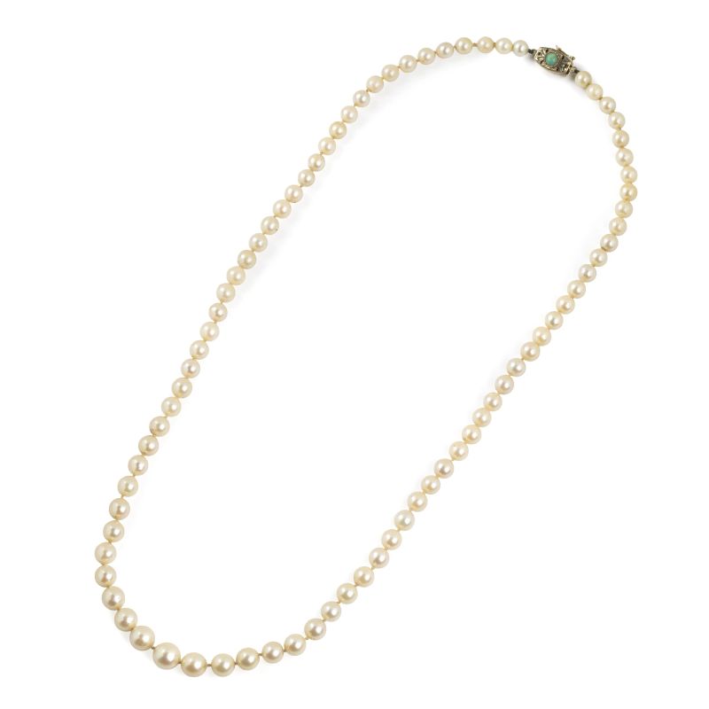 composta da un filo di perle di mm 6 circa, fermatura in oro giallo 18kt, chiusura a cassetta con sicurezza impreziosita da una pietra verde rotonda, punzone 750, lungh. cm 60 circa, gr. 34