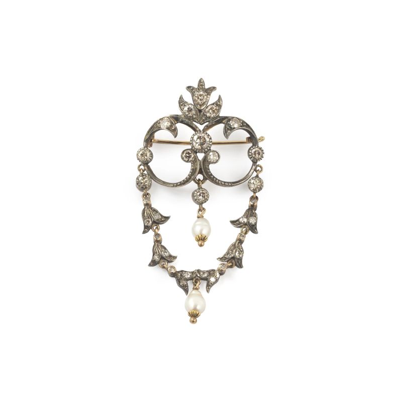 DIAMOND AND PEARL BROOCH IN METAL AND LOW TITLE GOLD