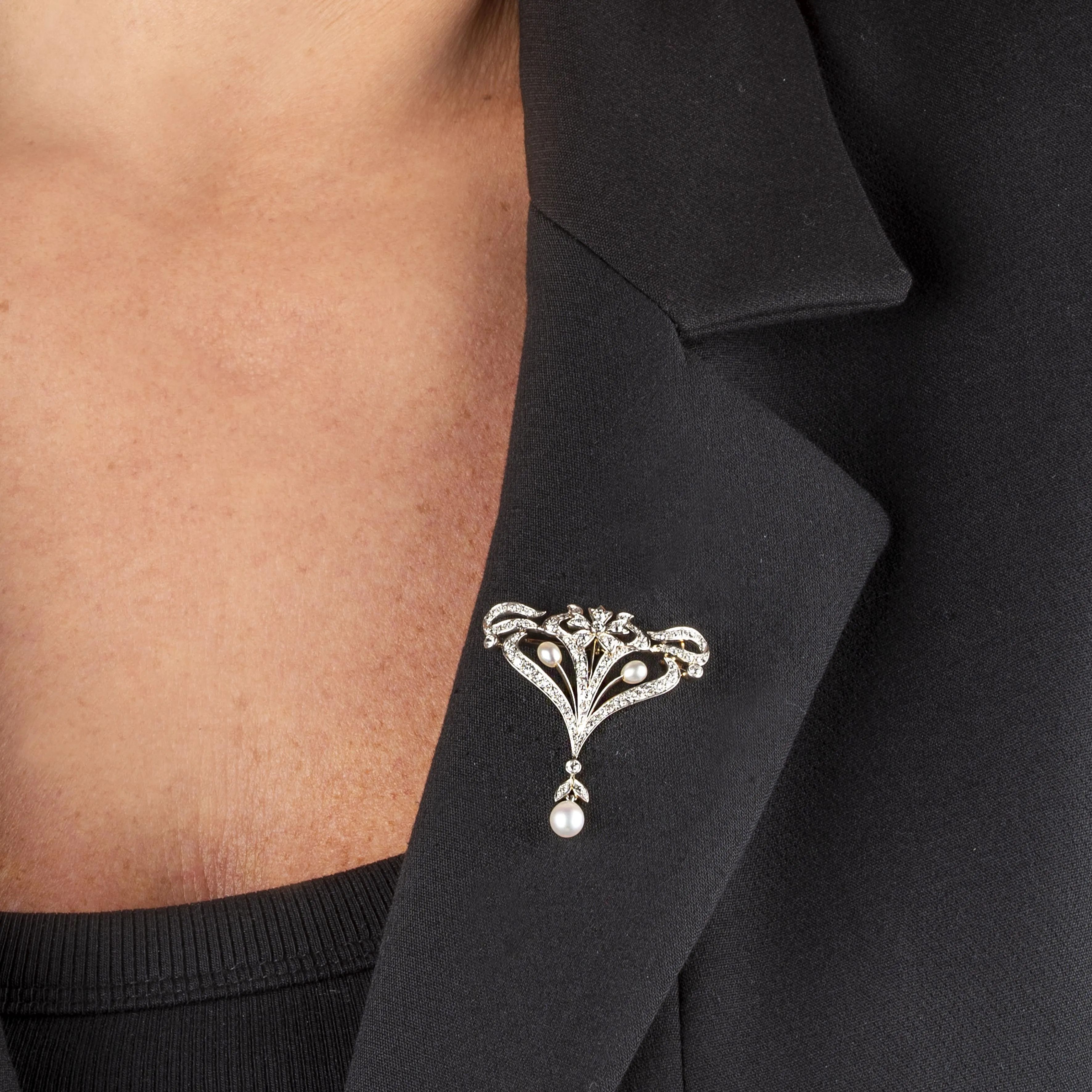 in oro bianco 18kt e giallo 14kt, dalle linee sinuose, impreziosita da diamanti taglio antico per ct 0.80 circa e tre perle pendenti di mm 5-3 circa, dim. cm 3x4 circa, gr. 7