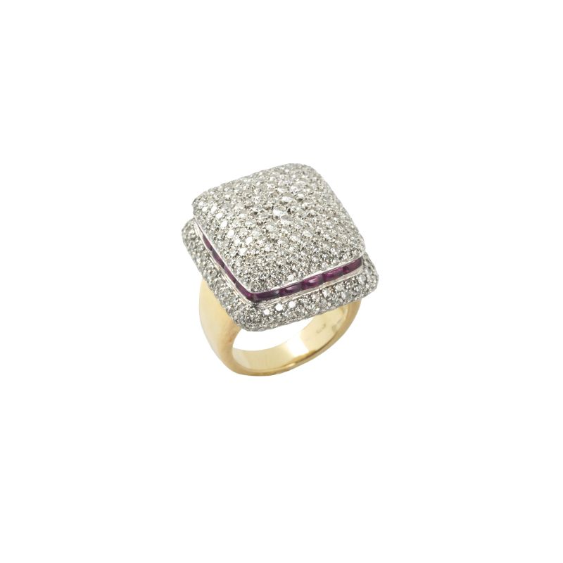 DIAMOND AND RUBY LARGE RING IN 18KT TWO TONE GOLD