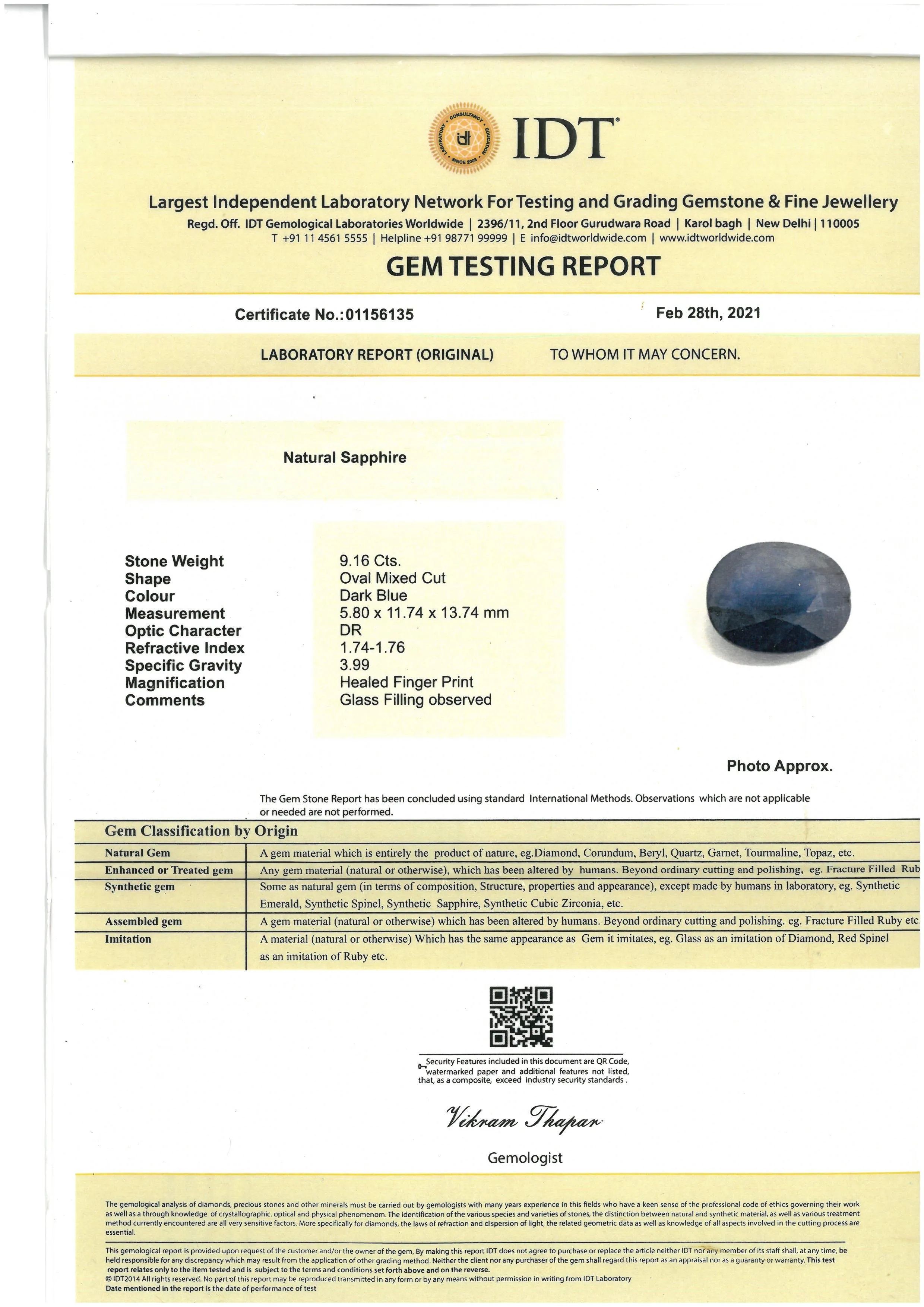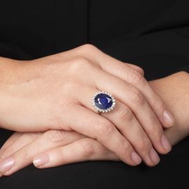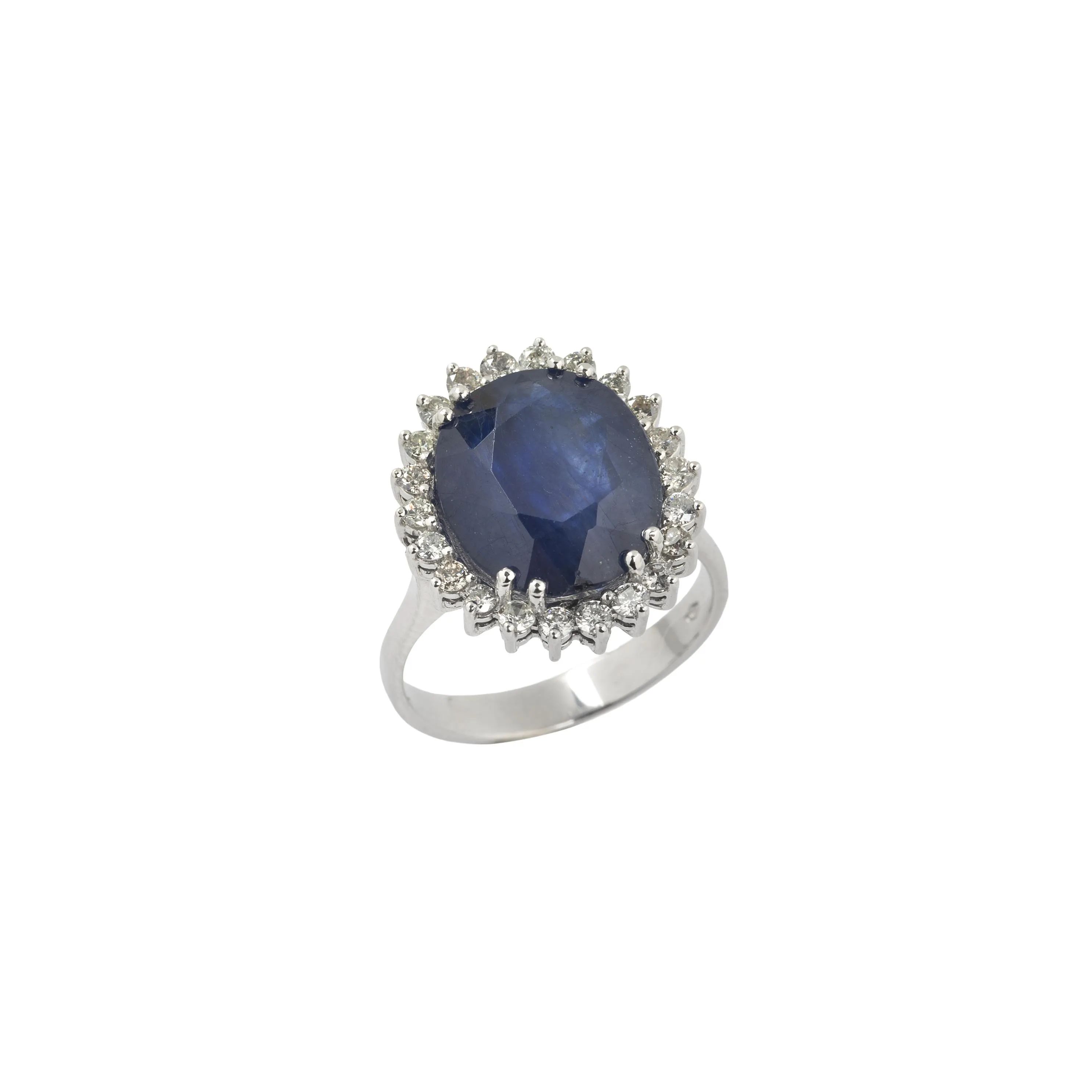 in oro bianco 18kt, impreziosito al centro da un corindone trattato con vetro al piombo taglio ovale per ct 9.16, circondato da diamanti taglio brillante per ct 0.40 circa, punzone 750, mis. 16/56, gr. 8, corredato di certificato attestante le caratteristiche della pietra