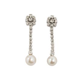 in oro bianco 18kt, impreziositi da diamanti taglio brillante per ct 3 circa e da perle di mm 9 circa, chiusura a vite, lungh. cm 4.5 circa, gr. 13 circa