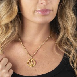 in oro giallo 18kt, raffigurante sagoma inginocchiata, incorniciata da un cerchio zodiacale, chiusura a moschettone, punzone 750 e del fabbricante, lungh. cm 45 circa, gr. 15
