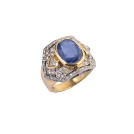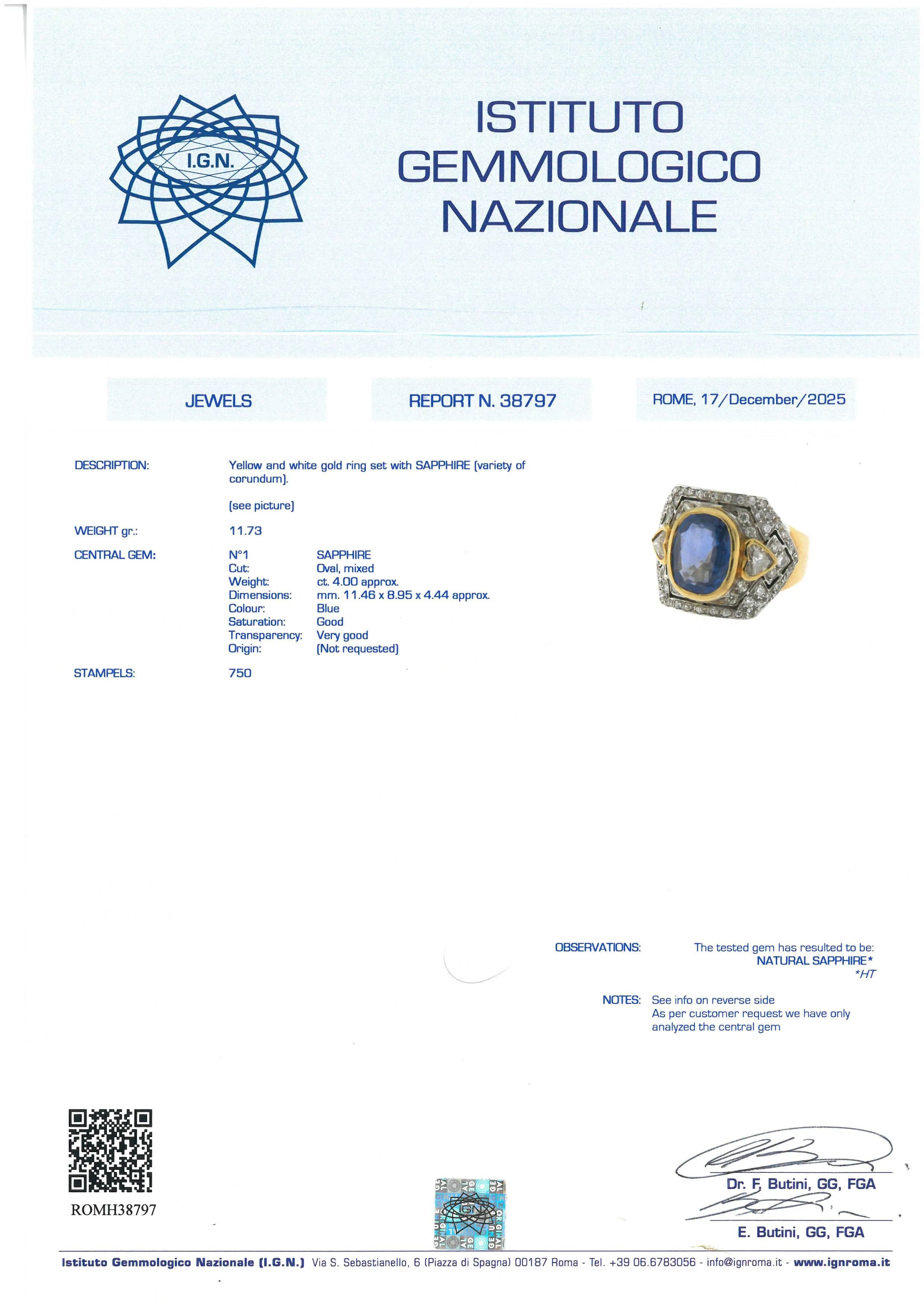 in oro giallo e bianco 18kt, impreziosito al centro da uno zaffiro taglio ovale di ct 4 circa, affiancato da diamanti taglio cuore per ct 0.80 circa e taglio brillante per ct 1.20 circa, punzone 750, mis.14/54, gr. 11 circa. Corredato di certificato IGN del 17/12/2025 attestante le caratteristiche della pietra
