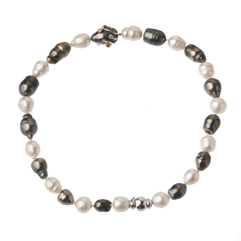in oro bianco e giallo 18kt, impreziosito da perle barocche South Sea bianche e grigie, fermezze in oro bianco, punzone 750 e del fabbricante, lungh. cm 43, gr. 69