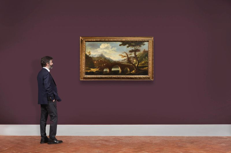 PAESAGGIO FLUVIALE CON PONTE E FIGURE